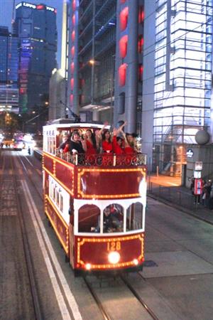 のんびり進むトラムのルーフトップに立ち、だんだん数を増すきらびやかなネオンサインに見とれていると、正面から賑やかなパーティ車両がやってきた。身体にぴったりしたドレス姿の、いい感じに酔っぱらった若い女性ばかりが、ルーフトップにぎゅうぎゅう詰めになって、音楽をガンガンかけながら踊っている。ちなみにこちら(ツアー車両)は、やたらと明るい中国音楽を控えめなボリュームで流しているだけだ。すれ違いざま、彼女たちは手を振ったり投げキッスやウインクをしたり。こちらまでちょっとテンションが上がる。ツアー車両は人びととのコミュニケーションも楽しめるのだ。