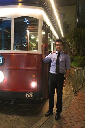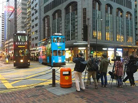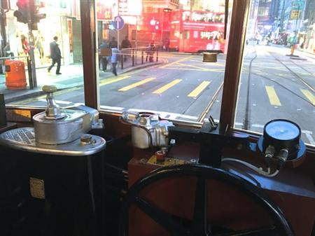 香港のトラムといえば、上部がふさがったエアコンなしの2階建てで、2階は天井高が低く圧迫感があり、いつ乗っても混んでいて、運転士はほとんど愛想がない。それはそれで旅情があるが、ツアーや貸し切りに使われるアンティーク車両はルーフトップ付きで開放感があり、眺めが抜群にいい。高層ビルのすき間に低く張り巡らされた頭上の架線は、手を伸ばして飛び上がればなんだか届きそう。