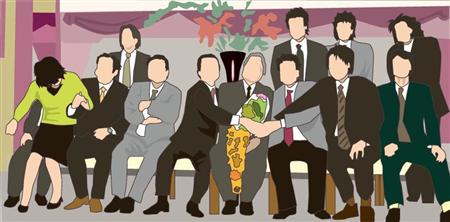 女性の証言をもとに再現した、記念撮影でのセクハラ被害のイメージ図。上司の膝の上に座らされ、別の男性社員に腕をつかまれた【拡大】