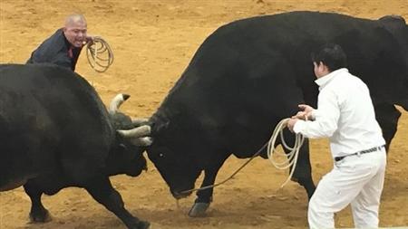 沖縄流は人と牛でなく、牛同士が1対1で戦い、対戦中は側にいる勢子がかけ声で牛を鼓舞します。「最大の武器である角は大きく分けて6種類、『トガイー』という垂直気味でカーブしたものが有利」と沖縄唯一の闘牛アナウンサー、伊波大志さんが解説してくれました。