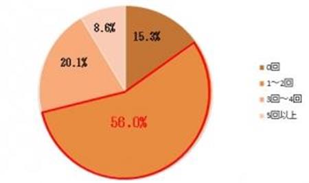 Q1:飲み会の頻度(1か月)についてお答えください。新社会人の方はどの頻度で飲み会があると思うか、社会人の方は実際の頻度を教えてください。(N=209名)56%の人が、飲み会の回数は月1~2回程度と回答。また3~4回と回答した人は20.1%、5回以上と回答した人も8.6%いることから、1か 月に少なくとも1回以上の飲み会を想定している方や実際に行っている方が8割以上(84.7%)ということがわかった。