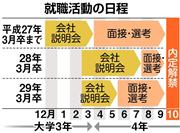 来年3月卒業予定の大学生・大学院生の就職活動は、企業の面接・選考が6月1日に解禁される。経団連の採用指針では解禁日が昨年の8月1日から2カ月早くなった。日程変更は2年連続。解禁日が前年までの4月1日から4カ月遅くなった昨年は人材争奪戦が激化し、内定を出す代わりに他社への就活を終わらせるよう強要する「オワハラ」が問題となったが、今年は沈静化しているという。ただ内定を前倒しで出す企業はむしろ増えており、選考解禁前夜には半分の学生が事実上の内定を得ているとの見方もある。