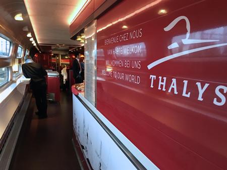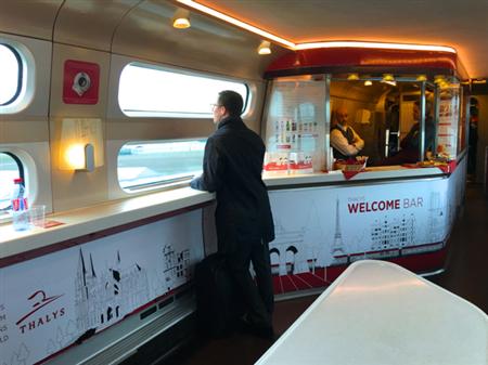 ここは“ルージュトレイン”の愛称で親しまれている特急列車「タリス」の食堂車。「ウェルカムバー」なんて可愛い名前がついている。外国で食堂車に乗るのは、私の数少ない趣味のひとつ。しつこく繰り返すが“二等車の通路側”という鉄道愛好家にあるまじき座席では手持ち無沙汰になり、そそくさと食堂車へ繰り出した。