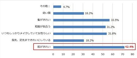 「日本人女性の魅力は何だと思いますか」という質問では、1位は「肌がキレイ」(42.4%)。次いで「髪がキレイ」(33.5%)、「ばっちりメイク」(31.8%)という結果となった。フリー回答では“奥ゆかしい”“スタイルが良い”などの回答も見られた。夏到来を機に、肌のお手入れで外国人にモテるチャンスがあるとうかがえる。