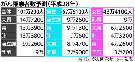 一方、28年にがんで死亡する人数の予測は37万4000人(男性22万300人、女性15万3700人)で、前年より3000人増加。部位別では肺(7万7300人)▽大腸(5万1600人)▽胃(4万8500人)▽膵臓(すいぞう)(3万3700人)▽肝臓(2万8100人)-の順だった。男性は肺、胃、大腸、肝臓、膵臓の順、女性は大腸、肺、胃、膵臓、乳房の順。