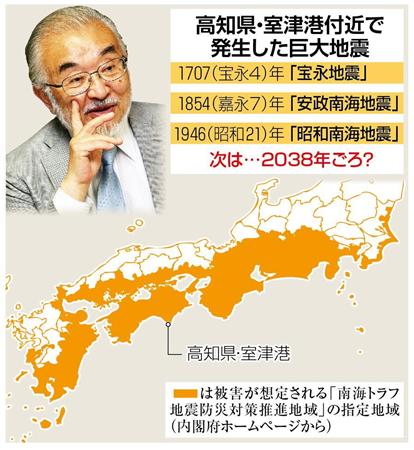 「南海トラフ巨大地震は2038年ごろ」。元京大総長で京都造形芸術大の尾池和夫学長は、過去のサイクルからこう予測しているが…【拡大】