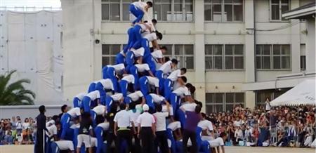 市教委が4月に策定した組み体操の安全に関するガイドラインでは、四つんばいで重なる「ピラミッド」は5段まで、肩の上などに立って塔を作る「タワー」は3段までと上限を設定。2段以上に重なる演技では、2段以上に乗る児童・生徒と同数以上の補助を配置することや、練習で一度も成功していない演技は本番では実施しないことも指示されている。
