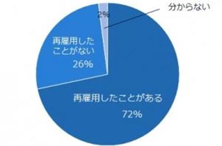 エン・ジャパンが一昨年、同社が運営する人事担当者向け中途採用支援サイト「エン 人事のミカタ」上でサイト利用者の392名を対象に行なった「出戻り社員(再雇用)」のアンケート調査によると、出戻り社員(再雇用)の受け入れをしたことがある企業は72%で、採用した目的は「即戦力」「ミスマッチがない」という理由が上位となった。