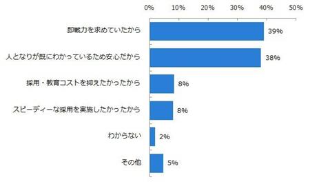 「貴社では、一度退職した社員を再雇用したことがありますか?」と伺ったところ、72%の人事の方が「(再雇用したことが)ある」と回答した。理由としては、「即戦力を求めていたから」(39%)、「人となりが既に分かっているため安心だから」(38%)の2つが多数を占めた。