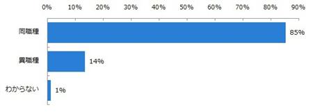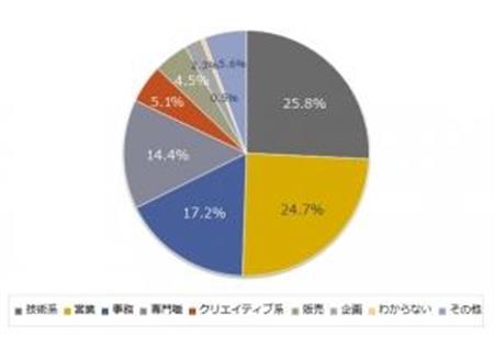 再雇用後の職種は85%の企業が、退職前と同職種であると回答しており、具体的には「技術系」(26%)「営業」(25%)が最も多く、「事務」(17%)「専門職」(14%)が続いている。