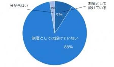 「一度退職した社員を再雇用する制度を設けていますか?」という質問には、「制度として設けている」という回答が9%に留まった。柔軟な働き方を支援するために、一度退職した社員がいつでも戻ってこられる環境を整えるため、制度化する企業が話題になっているが、まだ少数派と言えそうだ。