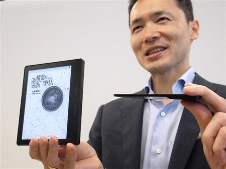 アマゾンジャパンの担当者が手にする電子書籍端末「キンドル」の新モデル【拡大】