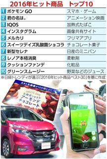 「ベスト30」は同誌創刊(1987年)以来の企画で、売れ行き▽新規性▽影響力-の3項目で評価した独自の順位付け。今年は、大ブームのスマホゲーム「ポケGO」が1位に立ち、新海誠監督のアニメ「君の名は。」や、煙が出ない加熱式たばこ「IQOS(アイコス)」なども上位にランクインした。