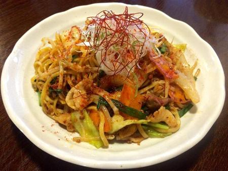 北海道産小麦の平麺、専用のピリ辛ゴマダレ、登別または近郊の食材を1品以上使うという閻魔大王からの3つの「掟(おきて)」を守れば、各店自由にアレンジできます。32店舗が知恵を絞り、イカやタコ、エゾシカ肉、野菜などを使ったもの、オムソバ、焼きそばパン、春巻き風まで具材もスタイルも多種多様です。