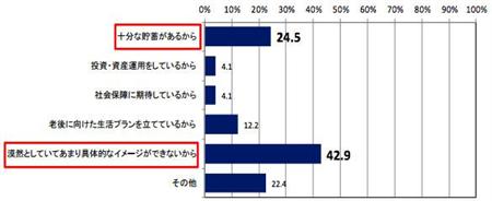 主婦のうち老後に「不安を感じる人」は約6割、「やや不安に感じる人」は約3割に上った。また、残る1割の主婦の「不安がない」理由をきくと、「十分な貯蓄がある」のは約2.5割にとどまり、4割以上の人が、漠然としていて自分の老後をイメージできない、と答えている。つまり、不安を感じていない人でも、老後の準備ができている人はごく少数であり、ほとんどの主婦が老後への備えが万全とは思っていないことが推察できる。