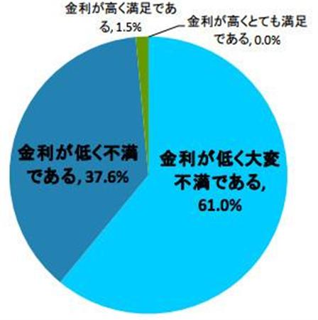 老後に不安を抱える主婦がとっている対策は、約5割が資金の貯蓄を挙げ最も多い結果になった。ただし、老後対策として貯蓄を選択する主婦が多い中、金利に満足している人はほとんどおらず、普通預金、定期預金を利用している人のうち、金利が低く「大変不満」が約6割、「不満」が約4割を占めた。