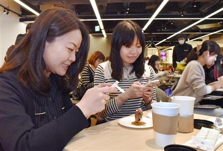 仙台市で開かれたイベントでスイーツの写真を撮る参加者=24日午後【拡大】