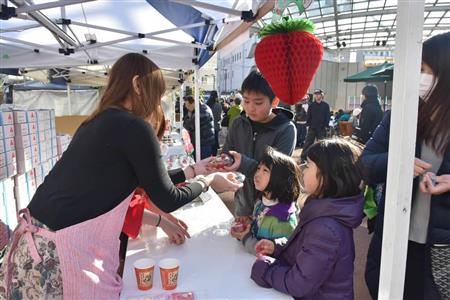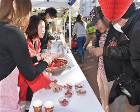 この日は仕事が休みだったという宇都宮市の男性会社員(43)は「会場がとてもにぎやかで、また来たい。イチゴを買おうと思ったが、長蛇の列で明日になってしまいそう」と苦笑いだった。