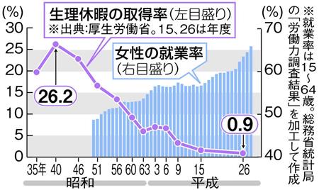 労働基準法で定められた生理休暇を取得する女性従業員の割合が、0・9%にまで低下していたことが25日、厚生労働省の調べで分かった。ピーク時の26・2%(昭和40年)から大きく減少。男性と同様に働く女性が増加する一方、妊娠・出産に向けた母性の保護の後退が改めて浮き彫りになった。