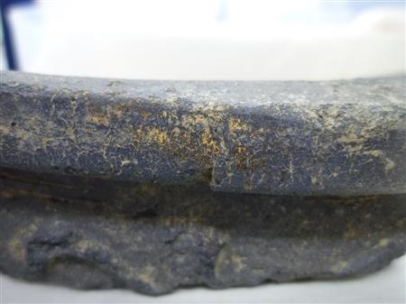 駿府城跡から昨年12月に出土し、7日に一般公開が始まった「金箔瓦」(静岡市提供)
