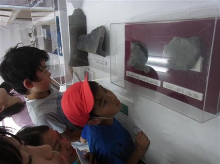 • 一般公開された駿府城の「金箔瓦」(ケース内右側)を見る小学生ら=7日、静岡市の「発掘情報館きゃっしる」(島田清撮影)