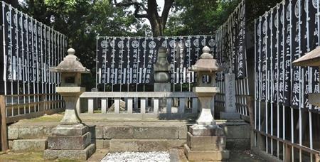若宮八幡宮社殿の横に鎮座する岡崎(松平)三郎信康の首塚=岡崎市朝日町【拡大】