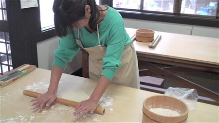 熟練職人の指導のもと、麺のタネを押しつぶしては広げ、つぶして広げを繰り返し、平らなめんに仕上げる。作業を続けること30分。めんが太すぎたり、厚すぎたりしても、そこはご愛敬(?)。