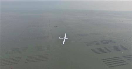 空中を舞う固定翼型のドローンは、AIやIoT開発を行うベンチャー大手、オプティムが開発したものだ。オプティムは佐賀県やノリ養殖漁業者で組織する佐賀県有明海漁業協同組合、佐賀大学、農林中央金庫、NTTドコモの産官学6者でAIやIoTなどの最新技術の活用を目指す協定を昨年3月に締結。ノリ養殖が本格化する昨年11月からこのドローンを飛ばし、本格的な実証実験に着手した。