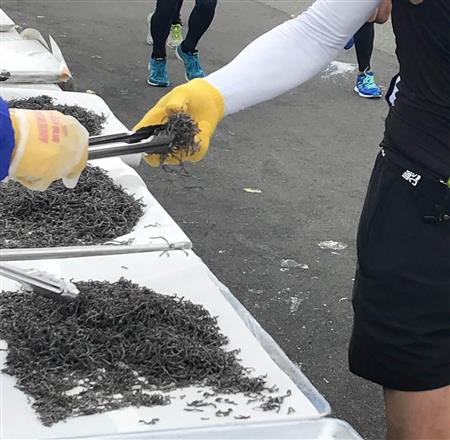 昨年11月に開催された神戸マラソン。30キロ地点直前の給食所に用意されたのは、何とご飯のお供である塩昆布だ。地元に本社を置く、食品メーカーのフジッコが、5年前から同大会に提供している。