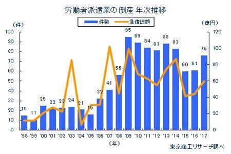 2017年の企業倒産全体は8405件(前年比0.4%減)とバブル期並みの低水準だったが、2017年の「労働者派遣業」の倒産は76件(前年比24.5%増、前年61件)と、2年連続で前年を上回った。