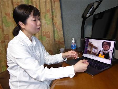 東京にいる同僚とノートパソコンでコミュニケーションを取る沢麻紀さん=大阪府枚方市【拡大】