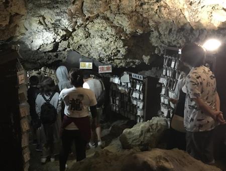 さらに、同酒造は販売店近くにある長さ270メートル、地下30メートルの鍾乳洞で泡盛を寝かせて古酒にしていることでも人気だ。トンネル状の鍾乳洞は風通しや水はけがよく、年中気温17~18度に保たれた内部は泡盛の貯蔵に最適な場所だという。
