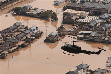 冠水した町を捜索する陸上自衛隊のヘリ=9日午前、岡山県倉敷市真備町(本社ヘリから、鳥越瑞絵撮影)【拡大】