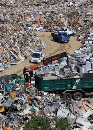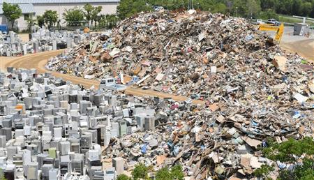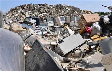 岡山県は全半壊した建物の棟数などから県内で約41万トンと見積もり、このうち倉敷市が約34万トンと大半を占める。堤防決壊などで地区の約3割が浸水した真備(まび)町地区があるためだ。同町内のごみ処理施設「吉備路クリーンセンター」には5日も冷蔵庫や木材、がれきなど、おびただしい量のごみの山が広がっていた。