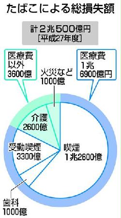 たばこの害による平成27年度の総損失額は医療費を含めて2兆500億円に上ることが8日、厚生労働省研究班の推計で分かった。たばこが原因で病気になり、そのために生じた介護費用は2600億円で、火災による損失は980億円だったことも判明した。