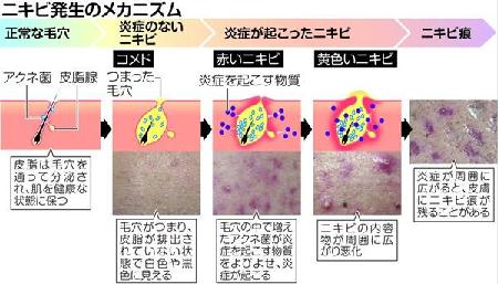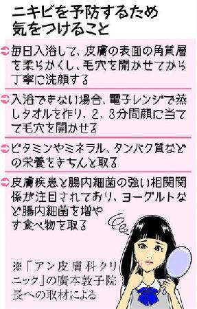 「アン皮膚科クリニック」(大阪市淀川区)院長の廣本敦子医師(46)によると、ニキビは、毛穴の入り口が何らかの原因で詰まり、本来毛穴から出ていくはずの皮脂がたまった「コメド(白ニキビ)」から始まる。その後、アクネ菌や黄色ブドウ球菌などが繁殖し、赤く膨らんで悪化。重症化すると顔にニキビ痕が残ることもある。