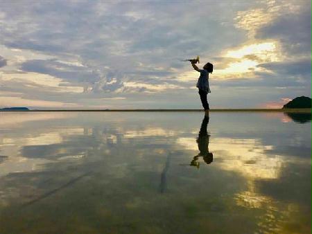 父母ケ浜は遠浅(とおあさ)なこともあり、干潮時には約1キロあるロングビーチのあちらこちらに潮だまりが出現します。風がないと、その潮だまりが水鏡となり、空や人物を水面に映し出すのです。幻想的な写真にするコツは、地面すれすれのローアングルで撮ること。このような風景が撮影できる条件がそろう場所は、全国でも貴重なのだとか。特に狙い目なのは干潮と夕暮れが重なる日。三豊市観光交流局のウェブサイトで干潮の時間が公開されているので、確認して出かけるのがおすすめです。
