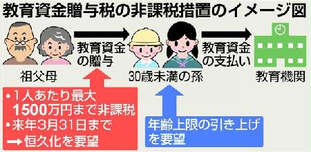 これを恒久措置とすることで、高齢者から若い世代に資産の移転が進み、同時に親の教育費負担を軽くすることができる。少子化が進む中、出産に躊躇(ちゅうちょ)する要因には将来の経済的不安がある。文科省はこうした不安を今後も軽減するため、恒久化を求める。30歳未満という年齢上限の引き上げも求める方針だ。