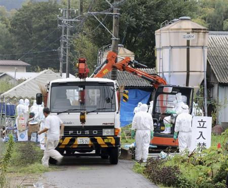 現場はJR岐阜駅から北東に約8キロの住宅と畑に挟まれた一角。豚約600頭の殺処分は同日午前8時半ごろに始まり、白い防護服に身を包んだ県職員らが慌ただしく出入りした。薬剤が飛散するのを防ぐために豚舎の周囲はブルーシートで覆われており、中の様子はうかがえなかった。