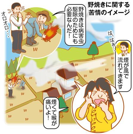 市環境衛生課によると、野焼きへの苦情は平成28年度で33件、29年度で62件だったが、30年度は7月末時点で114件と急増している。