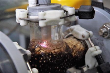 施設の奥に低温プラズマの発生装置が設置されており、沢からくみだした水が配水管を通る際、青紫色に輝く低温プラズマを照射されている様子をみることができる。