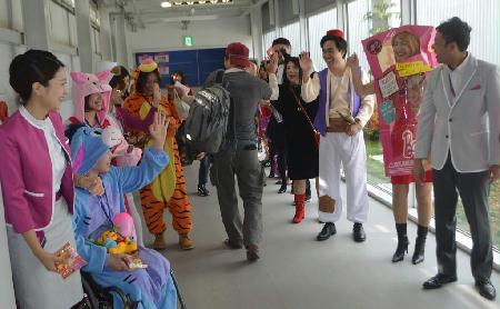 「ハロウィーン」の31日、関西国際空港では航空各社のスタッフらがハロウィーンにちなんだユニークな仮装姿で菓子を配るイベントが行われた=写真。
