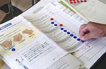 講座ではフレイルの兆候を知るため、専用の質問票を使って、栄養・運動・社会性の3要素に関する現状を自己採点。片足立ちや滑舌、握力などの筋力も測定した。ハンドブックに沿って栄養の取り方やスクワットの方法などの解説もあり、市民同士で明るく談笑する場面も。受講した男性(71)は「楽しくチェックできた。講座の情報を夫婦で共有して取り組みたい」と話した。