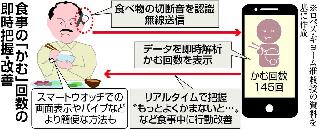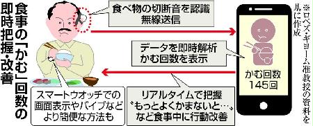 さまざまな生活習慣病につながる肥満を防ぐため、食事の際、かむ回数を増やして満腹中枢を刺激し、食べ過ぎないようにする方法がある。だが、食事時にかむたびに回数を測っていては、手間がかかって食事を楽しめないかもしれない。実践している人は極めて少数派だ。そこで、かむ回数の計測を、スマートフォンなどで可能にすることを目指す研究が行われている。鍵は「リアルタイムで本人に知らせる」ことにあるという。(山本雅人)