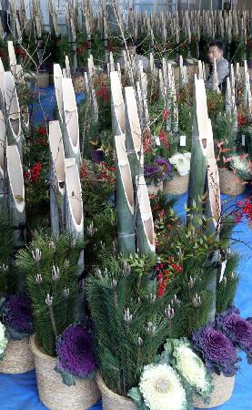 松や葉ボタンなどで組み上げられた門松は、高さ約60~240センチまでの約650組を出荷する予定。「今年は台風もあり、材料の調達には苦労しましたが、生産者さんがしっかりと育ててくれて例年通りのものができました」と同社の野尻真史さん(44)。関西一円の商業施設やオフィスに年末までに出荷されるという。