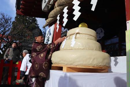 昭和57年から続く年末の恒例行事で、大勢の氏子や地域住民らが見守った。下段の直径は110センチで、上にはミカンの代わりに大型の柑橘(かんきつ)類、バンペイユが乗った。荒井清勝宮司は「新年は自然災害なく、平和な一年でありますようにと心を込めてお餅を奉納した」と話した。1月20日の鏡開きまで拝殿に飾られ、2月3日の節分で福餅として振る舞われる。