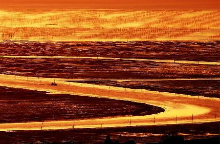 夜明け前、群青色の空が赤みを帯び、さらに明るい黄色へと変化していく。対岸の山の峰から太陽が顔を出すと、無数の海苔(のり)棚が並ぶ海は、黄金色に染まった。海から延びるつづら折りの線を1隻の漁船がゆっくりとなぞるように進み、航跡を残していく。この瞬間を待っていたカメラマンたちが一斉にシャッターを切る音が、静寂の中で鳴り響いた。