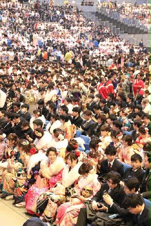 横浜市の成人式会場となった横浜アリーナでは、あでやかな振り袖などの多くの新成人が集まった=14日、横浜市港北区(王美慧撮影)【拡大】