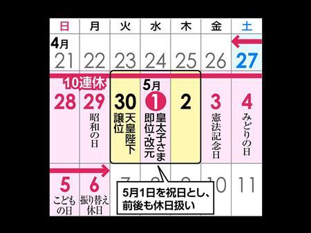 2019年のゴールデンウィークは、4月30日と5月2日が休日になり「10連休」となる【拡大】