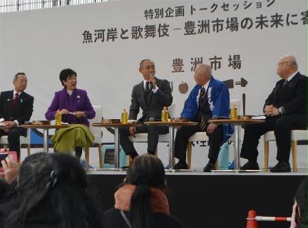 豊洲市場(東京都江東区)敷地内で開かれる生鮮食品などの一般販売イベント「土曜マルシェ」で16日、小池百合子知事と歌舞伎役者の市川海老蔵さんらがトークショーを行い、約500人の聴衆を前に豊洲市場の未来について語り合った。